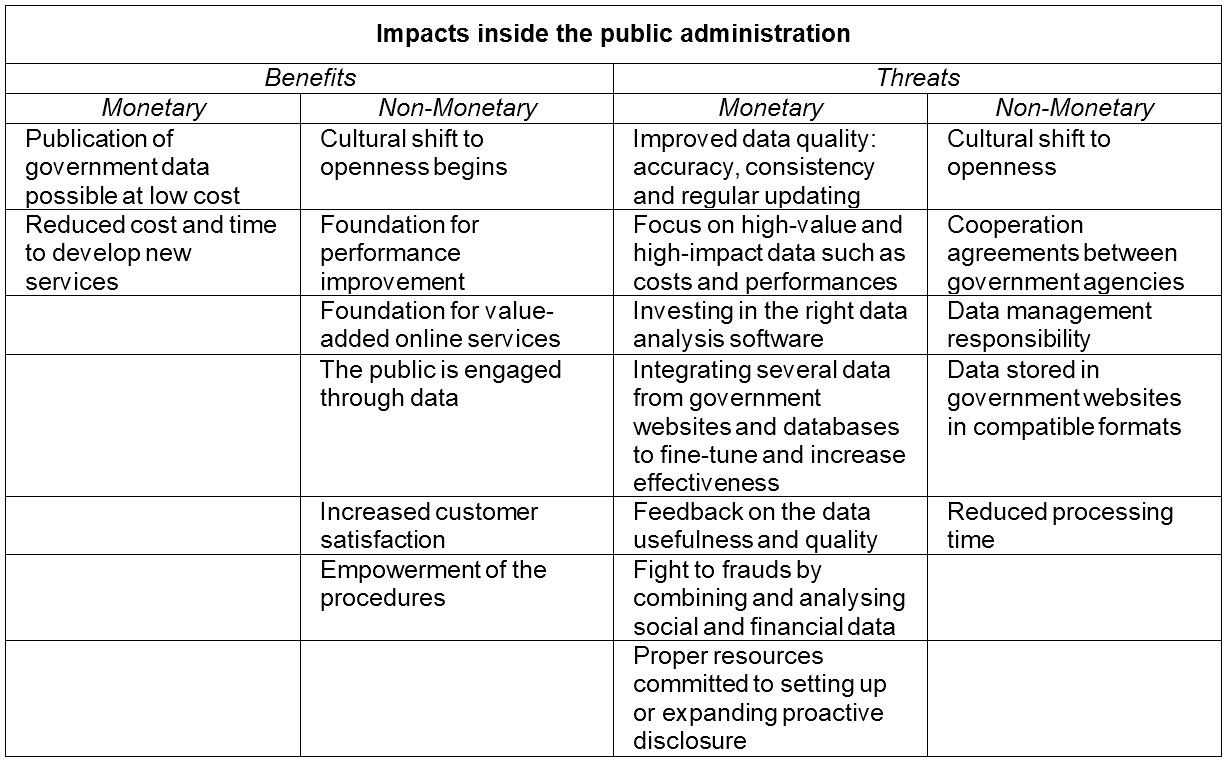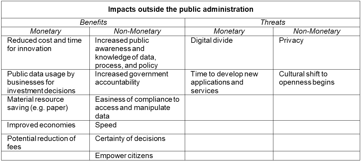 3. Governmental organizations manage several kinds of data during their daily activities [18]. All these data are used by government functions but they could also be handy for citizens and other actors in society. In many countries, the public data are now being viewed not as private government property, but as public assets to be leveraged by citizens, businesses and experts’ communities. Actually many of these organizations currently are reviewing and rearranging their processes, information and data to improve policies, services, enhance legitimacy and openness toward outside parties and citizens. The development of web portals and search services to support citizens and business companies in finding information and e-services in the Public Administrations’ websites is a very challenging organizational issue. Indeed, over the latest years the number of PAs digital services, mainly on the web channel, and of sources of e-government data [19] increased at an impressive rate. By merely considering Italian Public administrations, there is an estimated number of about 50.000 websites, with millions of pages. Digital public services can be defined as the view of public entities (and their services) in the virtual world (web, social networks, e-mail channels, mobile devices, etc.) and is the result of the work of thousands of autonomous (public) entities organised in a sort of huge federated enterprise. In this context, many countries are developing their strategic plans for Open Government initiatives launching pilot portal that manage the knowledge published over the Internet by public administration on a national scale to support stakeholders in finding the information they need within the digital public administration. The search.usa.gov site provides a notable example of this kind of portal: it provides an interface, which allows performing traditional keyword-based search queries with a simple and easy interface. Search.usa.gov integrates the web search service provided by means of a well-known public search service with other specialised search services, such as, for example, the recall search service, which makes it possible to find recall announcements (i.e. request returns of a product to the manufacturer, for necessary repairs or adjustments) published on several governmental websites [20]. Transparency and open data can be powerful tools to stimulate and support public services’ improvements, faster innovation and empower citizens’ rights. The easiness and the immediate access to relevant public information, government processes and better performance can be a significant driver, with open data increasingly enabling the creation of valuable new services and applications [21, 22]. It is important to differentiate between “access” and “availability” from the users point of view – because for example a technical system might be available for citizens to use –but some citizens might not be able to use it due to specific circumstances – e.g. people on benefits could have access to internet based applications and payment, they might even have access to Internet – for example by using computers made available to unemployed people in community centres, etc. However to get state benefits via the eGovernment system the citizen might need to have a bank account – in UK case it turned out that many people on state benefits did not have any bank account for the simple reason that the banks do not want to give people who have no jobs an account. Until the new eGovernment system was put in place all these people on state benefits were able to get their money via the Post Office with the use of a personal post check. With the new system, the checks were not used anymore as no one had considered that there were (adult) citizens in the UK who could not get a bank account. So here is an example of people having access and some availability – but the actual availability of the service is not truly possibly to realize and so the intended benefits were not achievable – even if the technical system was developed on time. On budget and within specification – “and” the availability issue had been addressed – still this was not enough. The reasons for “failure” are not within the “functional specification” and also not within the “structural problem space” but instead the problems are completely within the space of the human activity system. To better understand Table 1 it identifies a sequence of monetary (economically quantifiable) and non-monetary (not economically quantifiable) benefits and threats not only for business and citizens users, but also for the public administration itself [23].