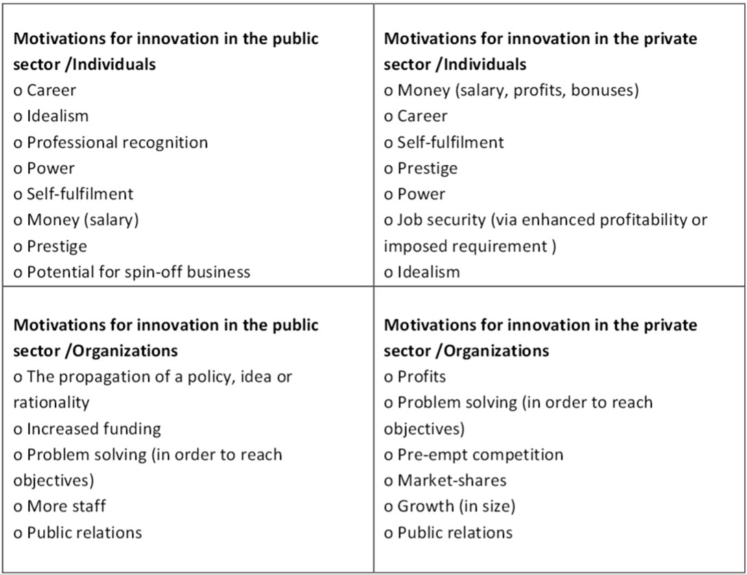 Recent debate and associated initiatives dealing with public sector innovation have mainly aimed at improving the effectiveness and efficiency of the delivery of public services and improved transparency and user friendliness [37]. Beyond typical administrative reforms, innovation is expected to help address societal challenges such as the aging population, inclusion, health care, education, public safety, environment and greenhouse gas emissions reduction. The public sector consists of a complex open system of organizations with various tasks. Therefore, decision-making can be slower than in the private sector because of large chains of command. It is widely reported that without licence from the top, few people in hierarchical organisations are willing to take risks [38]. Political and official leaders can establish a culture in which innovation has seen as natural. Several writers thus see leadership as a key link between individual creativity and knowledge and organizational innovation [39]. Leadership should come from the highest level, but middle management can also be very important. Leaders need to dedicate resources to innovation and to act on employee suggestions. They should also protect innovative employees from internal and external critics and at the same time convince politicians of the need for innovation.
