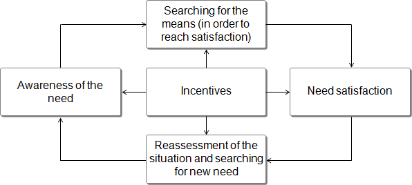 2. A lot of researchers addressed the aspect of motivation at work analyzing the factors that take place from job satisfaction and job dissatisfaction. The motivation at work can be defined as the inner drive that leads individuals to apply with energy and enthusiasm. It is a kind of internal strength [7] that stimulates, regulates and supports the major actions (taken by the subject involved) and can be described in a cyclic way: the individual searches for the tools in order to satisfy his/her own need, perceived as an inner tension; when it is satisfied, the subject checks for new and additional needs. Motivation is inside the individual and cannot be induced from the outside. Through external interventions it is possible to urge or, at most, to fuel it.