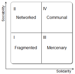 The box related to the “fragmented” concerns with the workers who interact with low sociability and little solidarity: goals are not perceived and interpersonal relationships are not present (sometimes it could happen that employees work remotely and they do not know each other). People in the “networked” box upgrade friendly relationships but are not so interested into sharing common objectives and tasks. The third box (“mercenary”), instead, has a strong focus towards the goals: typically these communities have short live and are highly motivated in the achievement of specific goals (i.e. Soldiers, Project Work Teams; even if the work experience is finished, during the time, the period spent together is remembered nostalgically and with pleasure). The ideal organization is the organization of citizens (“communal”) [16] where the degree of sociability and the degree of solidarity are both high: the persons are strongly motivated into achieving their professional tasks, sharing suggestions, observing deadlines, partaking into meetings and, in the same solution, into establishing social relationships rather hardly (sometimes co-workers become good friends and they also meet each other after work for informal drinks).